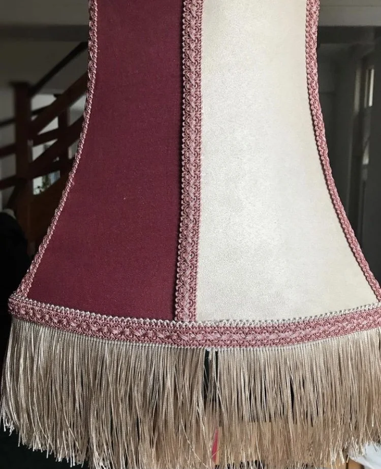 Suedette rose pink and cream alternate panels offering tastes of a summer favourite. Dusky pink struts dipping into a heavy cream fringe.